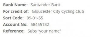 Payments should be paid directly into the Gloucester City Cycling Club bank account, details of which are below.