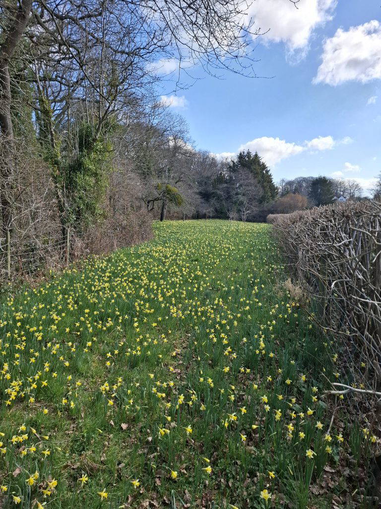 Ten riders set off in search of daffodils and went via Maisemore to avoid the busy Newent road. The sun was out but there was a cold NE wind to battle against. At Newent we took the Kempley road and began to see the wild daffodils until we reached Gwen and Vera’s Wood where one member said ‘is this it?’, not realising that over the hedge was a host of golden daffodils.