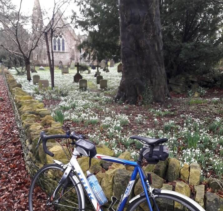 A flatter route was chosen by the Captain for his planned ride to Eastwood Garden Centre, one of our more distant Sunday ride destinations. The ride started badly when Ken punctured before Southagte became Bristol Road, then the fierce headwind took its toll on our speed. The death knell to our plans for coffee at eleven came with Ken’s second puncture. The only person happy about it was Mark, who could see that his previously dominant lead in the competition for Bruce’s Bonus was being rapidly eroded. After we crossed the canal below Blunder Lock Paul made the mistake of asking the Captain where the side road, Millend Lane, led. This encouragement was all that was needed to divert the route over Cress Green on a surfaced but rather narrow path – too narrow for a bike to pass a baby buggy, as we discovered.